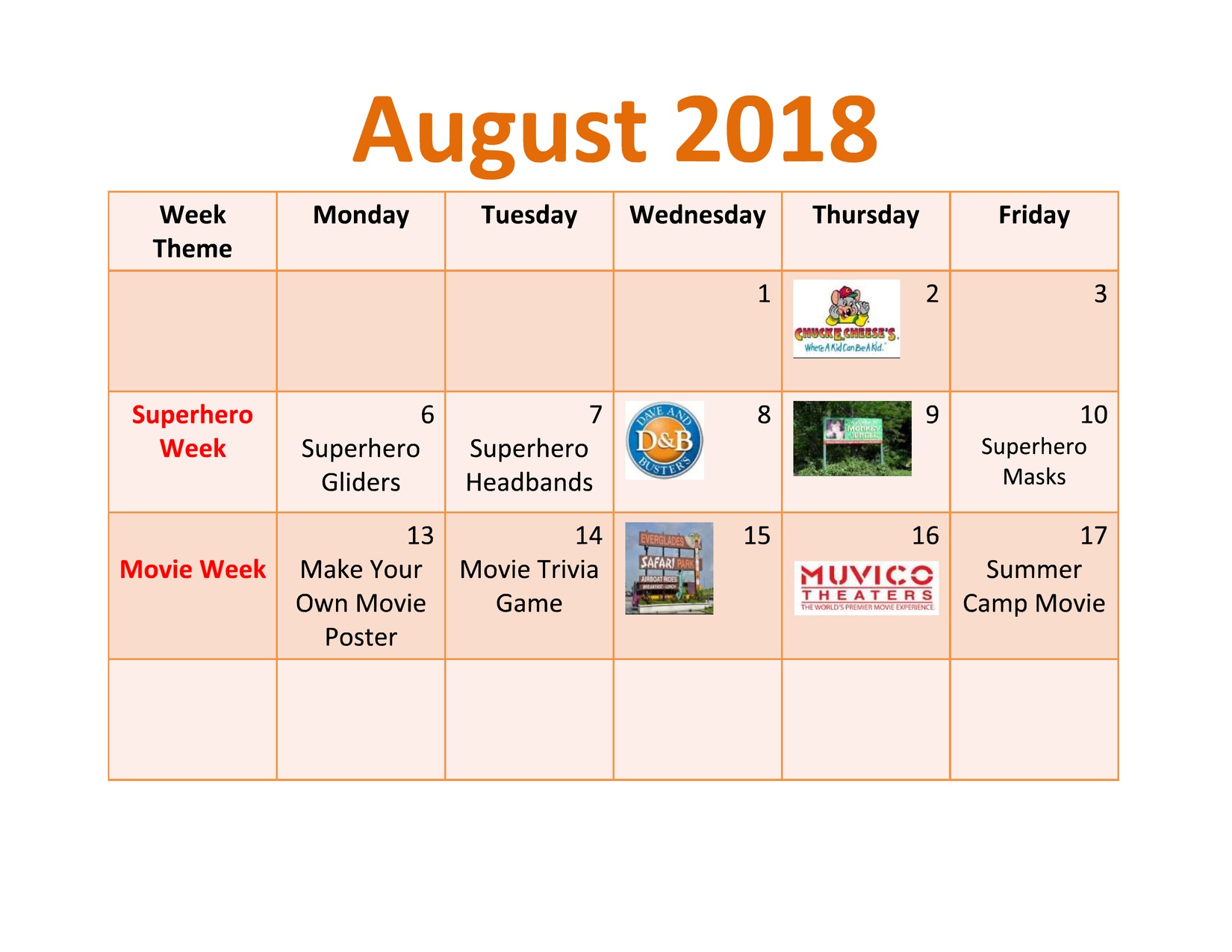 Summer Camp Calendar August 2018